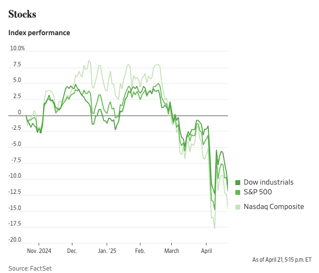 The Dow Jones Industrial Average shed almost 1,000 points on Monday and is headed for its worst April performance since 1932, according to Dow Jones Market Data. The S&P 500’s performance since Inauguration Day is now the worst for any president up to this point in data going back to 1928, according to Bespoke Investment Group.