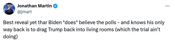 This is a BIG risk for Biden. Look, this is the reality: Biden LOOKS much older than Trump. (Yes, I know they are only four years apart in age. And, again yes, I know that Donald Trump eats horribly and never exercises.) But, just look at and listen to the two men — objectively. Biden moves haltingly. He speaks haltingly. He looks old. Trump says all manner of weird/crazy things but he looks energetic and with it while speaking. That’s just the reality — whether you like it or not. And that reality means that Biden has to be very careful not to stumble — physically or verbally. Or to look like he didn’t hear questions. Or like he is out of it at all. Now, he’s done this! His State of the Union speech was so good that it led Trump to speculate that Biden was on cocaine. (I still can’t believe a) that happened and b) we don’t keep talking about it.) But this is a high-wire act without a net. HUGE stakes.