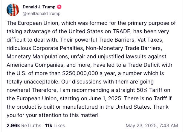 We know how this ends, right? If Trump goes forward with a 50% tariff against the EU, the stock market will react poorly. The bond markets will follow suit. The U.S. dollar will get shaky. And that will all lead to declining confidence in both the overall strength of the American economy and in Trump’s ability to handle said economy.