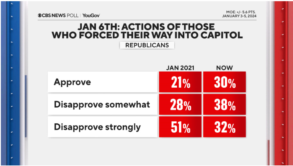 A CBS News poll on the three year anniversary of the riot showed Republicans softening in their condemnation of that day.