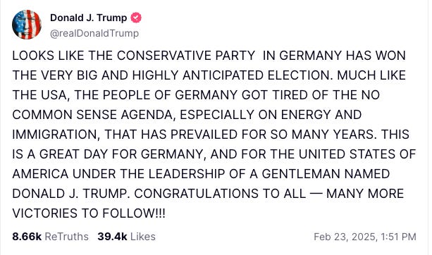Vice President JD Vance and DOGE head Elon Musk both publicly advocated for the far right AfD party. While AfD did get its highest percentage of the vote ever, it will be left out of the governing coalition in Germany as Merz has pledged to never work with it or its leaders. (Like I said, this guy ain’t Donald Trump for Germany!)