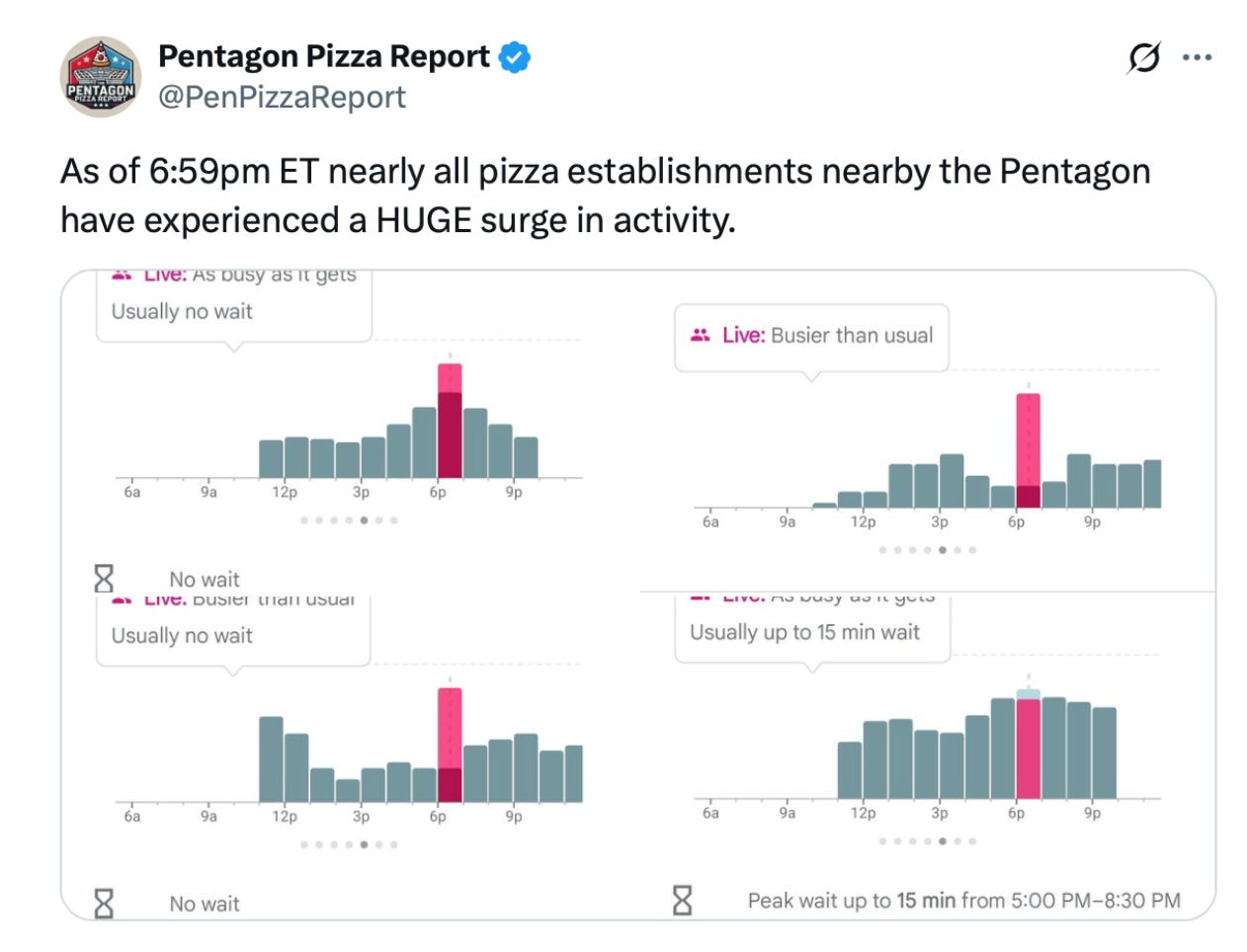 The Pentagon Pizza Report is a fascinating way to track activity in and around the Defense Department. Look at the rise in pizza orders just before Israel attacked Iran!
