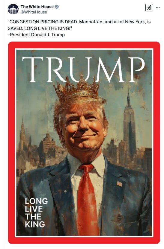 After ending congestion pricing in New York City, President Donald Trump declared (in a reference to himself): “Long Live the King.”